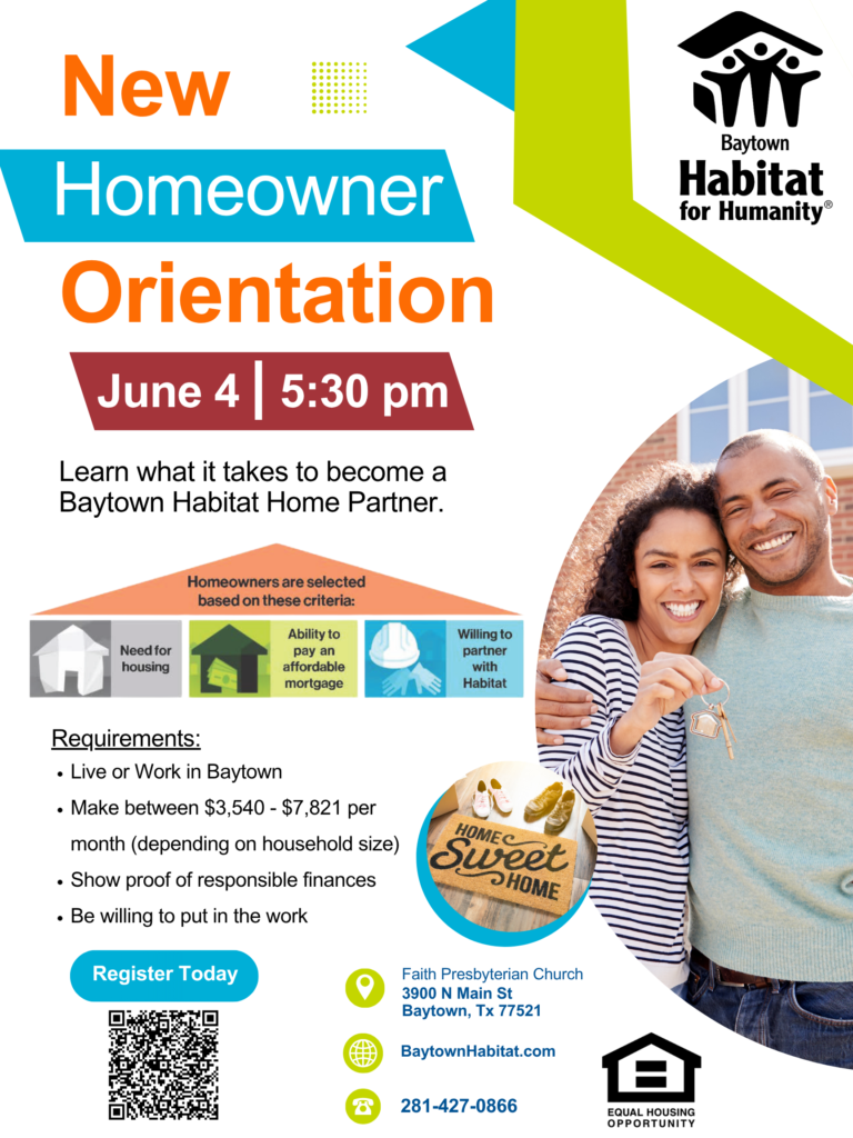 Learn what it takes to become a Baytown Habitat Partner Family. Come to our meeting and see if it is a good fit for you and your family.