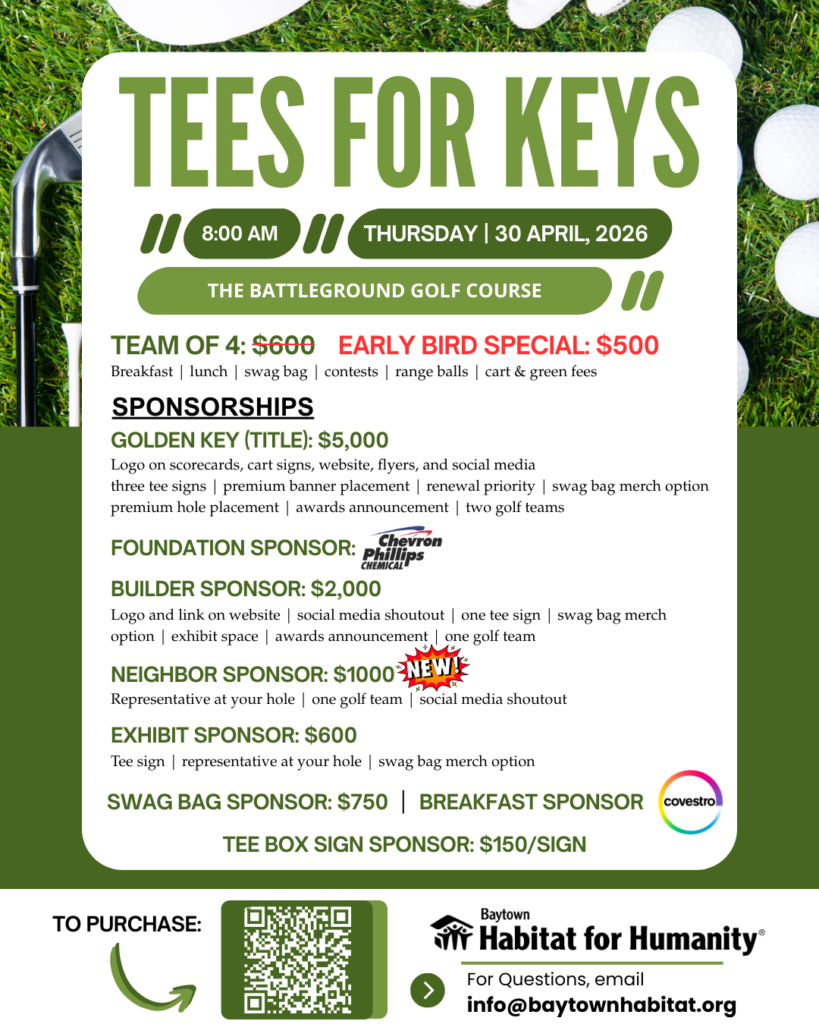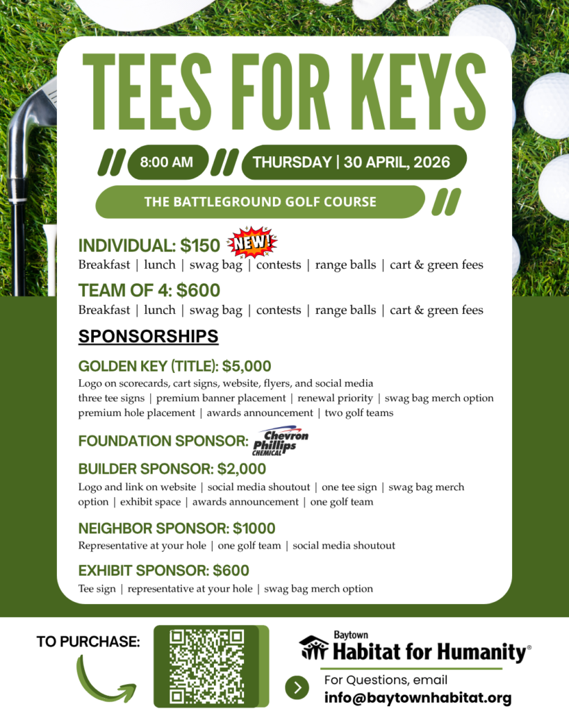 Our first “Tees for Keys” Golf Tournament is officially set for April 30 at Battleground Golf Course. This event will help us raise the funds needed to build more safe and stable homes for families right here in Baytown.