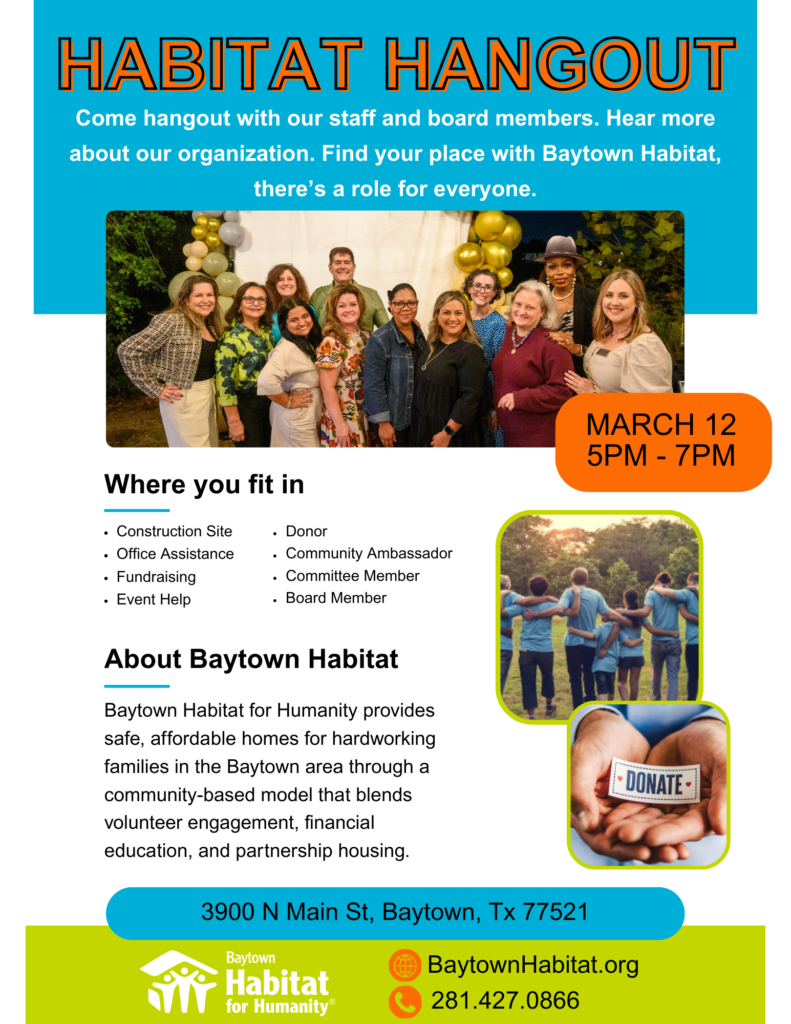 Join us for Habitat Hangout, a casual come and go event where you can meet Baytown Habitat for Humanity staff and board members and learn how to get involved. Whether you are interested in volunteering, serving on a committee, supporting events, or giving back as a donor, there is a place for everyone.